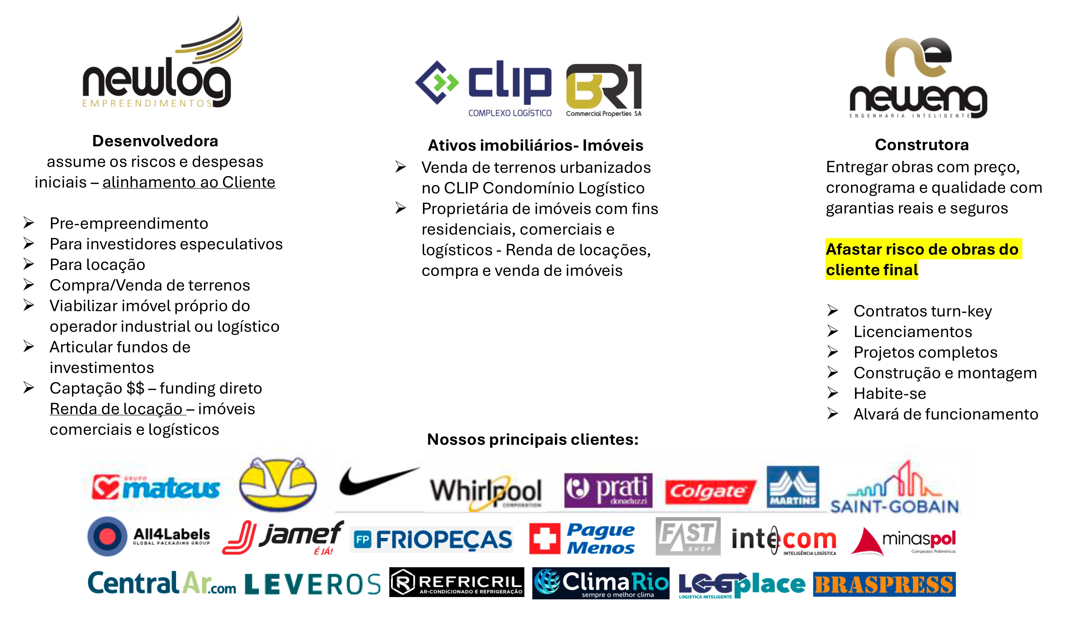 A Newlog é responsável pelo desenvolvimento dos seguintes produtos imobiliários logísticos e industriais: